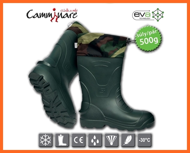 Bemutatjuk a Camminare habkönnyű EVA anyagból készült Voyager Camo bélelt csizmát, melynek bélését eltávolítva még akár nyáron is kényelmes vízhatlan csizmát kaphatunk. Bármely terepen kényelmesen járhat benne. A csizma sarok részénél kialakított perem nagyon megkönnyíti annak levételét. A bélés vastagsága miatt érdemes 1 mérettel nagyobban gondolkodni.