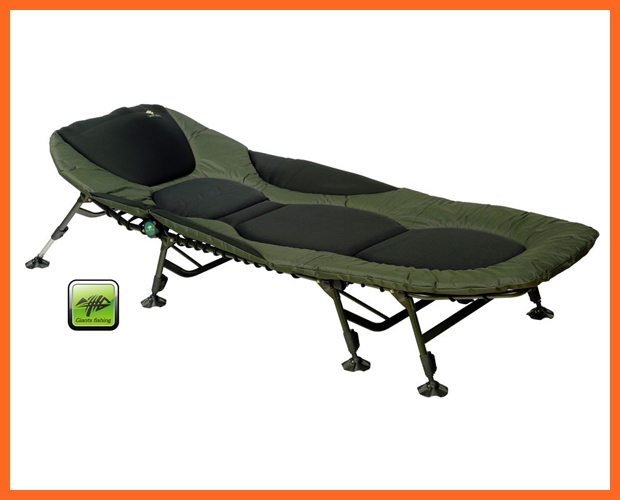 A horgász ágy anyaga 600D polyester amit az alján egy PVC anyaggal vontunk be. Az ágy középső részén egy 3 cm vastag habréteg van, amely pórusos anyaggal van bevonva, amely elszívja a nedvességet és növeli a kényelmet. A fejrész egy erősen párnázott neoprén párna, amely nyáron kényelmesen lehűl és télen pedig felmelegszik. Ez a nagyon stabil nyolc lábú horgász ágy kiváló minőségű anyagokból készül, nagyon erős, tartós és kényelmes, állítható fejrész rész és meghosszabbított lábakkal van szerelve. Szilárd alumínium konstrukció (20 mm átmérőjű) nagyon tartós, speciális kivitelben, olívazöldben.