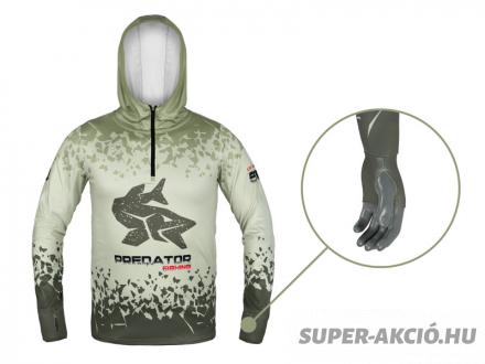 Tervezésekor figyelembe vettük azt is, hogy a melegnek leginkább kitett testrészünk a fejünk. Ez a póló jelentősen megemelt gallérral és kapucnival rendelkezik, valamint hüvelykujjlyukakkal ellátott meghosszabbított ujjakkal, ezzel fokozva kézfejünk védelmét. A kényelmes, rugalmas anyag nagy előnye, hogy gyorsan szárad, ha horgászat közben elázna.