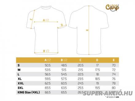 Maga a póló kiváló minőségű, akárcsak a rajta lévő színes nyomat. Széles méretválasztékban kínáljuk az S-től a KING SIZE-ig (4+XL-nek felel meg, amit a legtöbb országban XXXXXL-nek neveznek). A King size méretű modell még a legnagyobb horgászok számára is megfelelő, akik akár 135 kg-nál is nehezebbek.