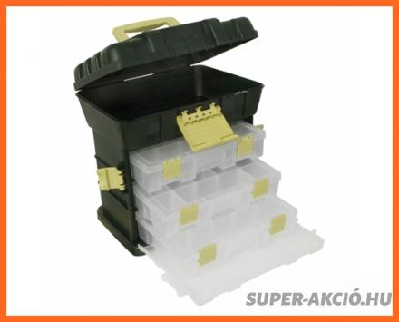 A műanyag láda átlátszó előlapját lenyitva, 3 db 27,5x18x5,5 cm-es dobozt tartalmaz. A különböző osztásokkal, rekeszekkel szabadon variálható dobozok, hihetetlen mennyiségű aprócikket és horgászat során nélkülözhetetlen kelléket képesek elnyelni.